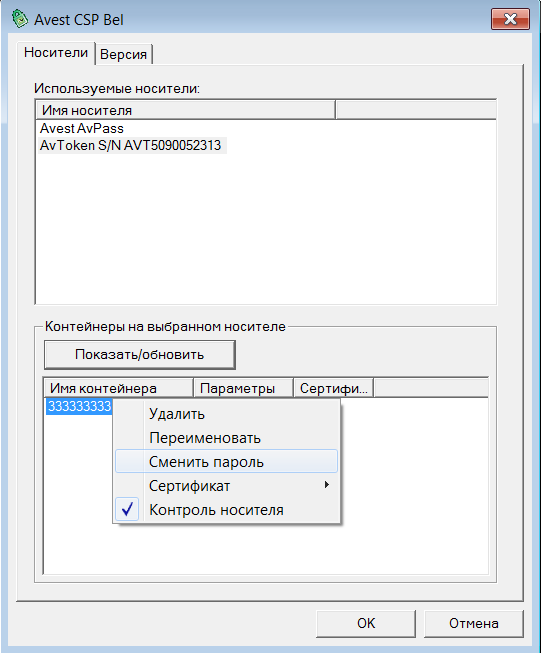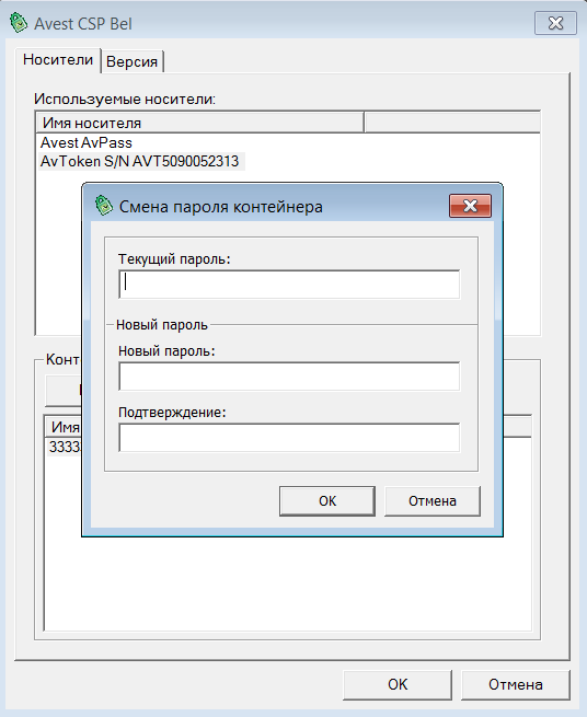 5. Введите текущий пароль доступа к контейнеру, затем новый пароль и подтверждение (т.е. повторите новый пароль). Нажмите «ОК».