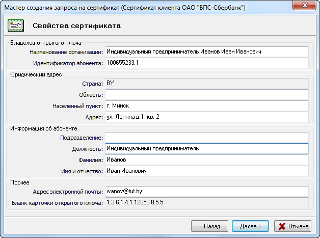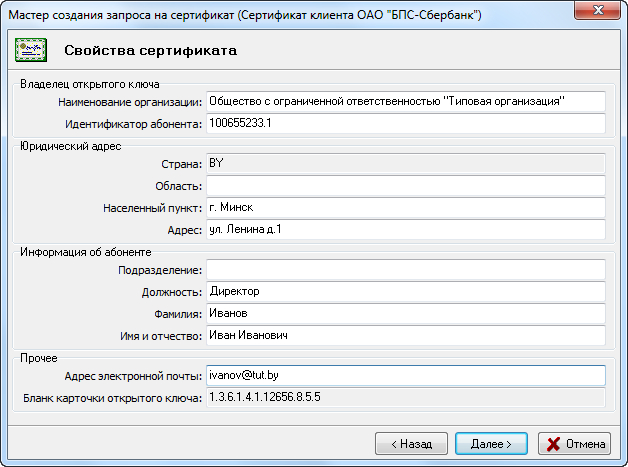 Адрес – местонахождение организации, в которой работает будущий владелец ключа.