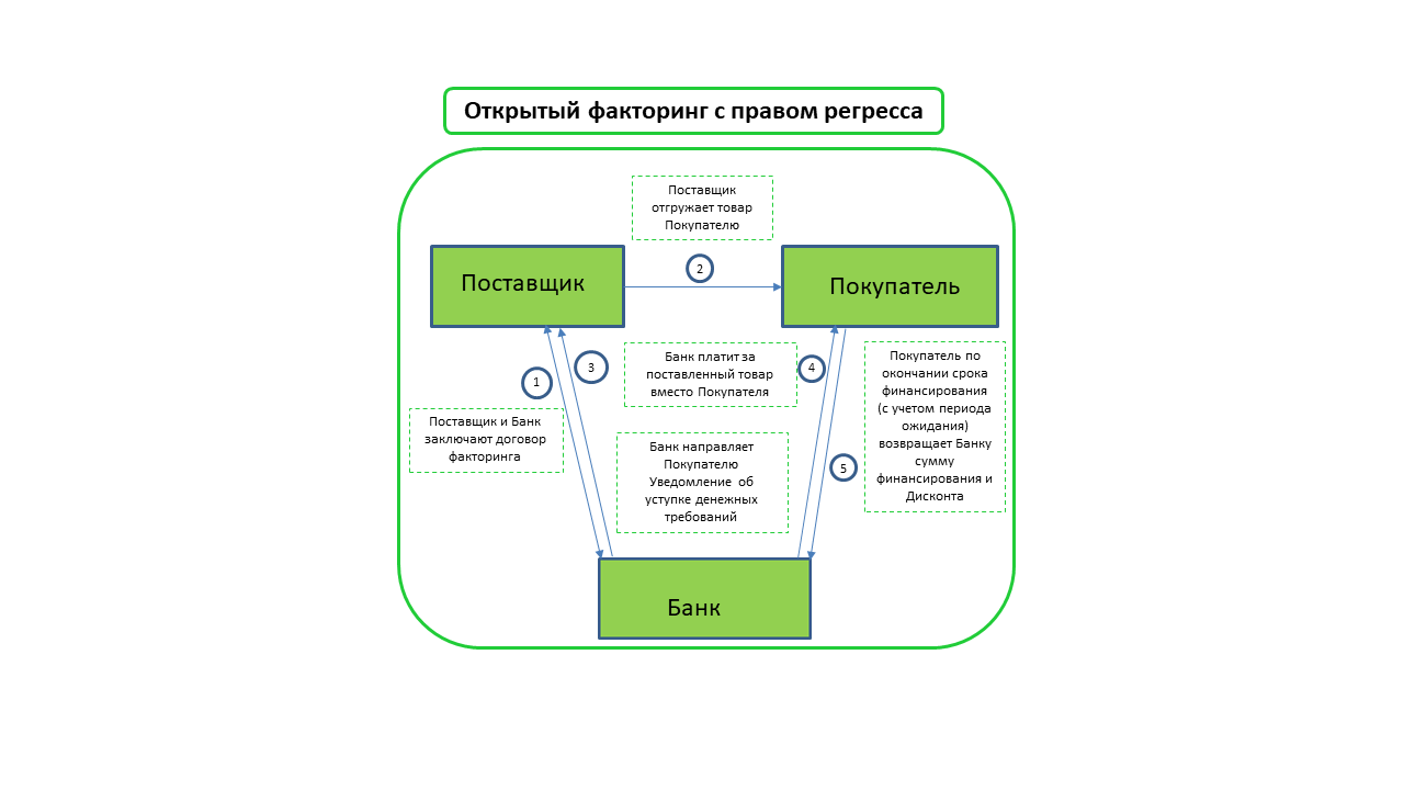 • Факторинг с правом регресса – Банк имеет право вернуть Поставщику неоплаченные Покупателем денежные требования